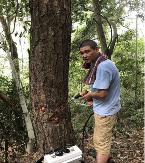2022年9月8號,汪洋帶上綠友電動樹干打孔注藥機(jī)、木塞、藥品以及相應(yīng)工具。早上五點鐘從廣州出發(fā),舟車勞頓數(shù)百公里,踏上拯救坪坑參天古樹的旅程。趕到潮州坪坑村,村委部文主任領(lǐng)路去村后的山上查看古松樹。在看過所有的古樹以后,根據(jù)松樹的枯葉癥狀,樹木呈現(xiàn)出來的病癥,最后診斷確認(rèn)是松材線蟲危害所致。汪洋將診斷結(jié)果以及解決方案告知文主任,并通過電話向省林業(yè)部領(lǐng)導(dǎo)作匯報,得到批復(fù)后立即展開作業(yè)。