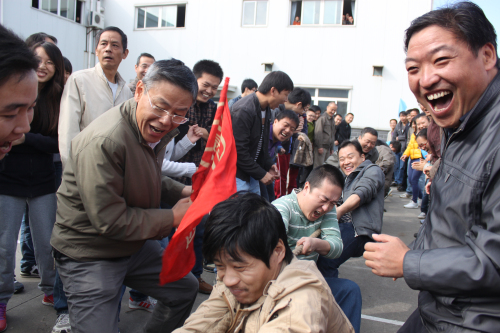 拔河比賽是最考驗(yàn)團(tuán)隊凝聚力的項目了。裁判員一聲令下,所有的選手勁往一處使,勒緊麻繩不放松,在強(qiáng)有力的“1、2、3”的口號下,每個參賽者使出九牛二虎之力,把繩子往自家起點(diǎn)線邊拉。只見繩索中心的紅線忽而左忽而右,參賽選手們絲毫不放松,腿彎了、差點(diǎn)就坐在地上了,大家又一股力量地往回拉。圍觀的同事們急得直跺腳,嘴上喊著“加油、加油”,手還一直往一邊“推”,好像自己也在拉著比賽繩一樣。在這場力量與意志的比拼中,拓寶二、營銷二部、草坪灌溉聯(lián)合組奪得了最后的勝利。