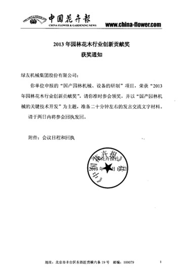 綠友榮獲“2013年園林花木行業(yè)創(chuàng)新貢獻獎”獲獎通知: