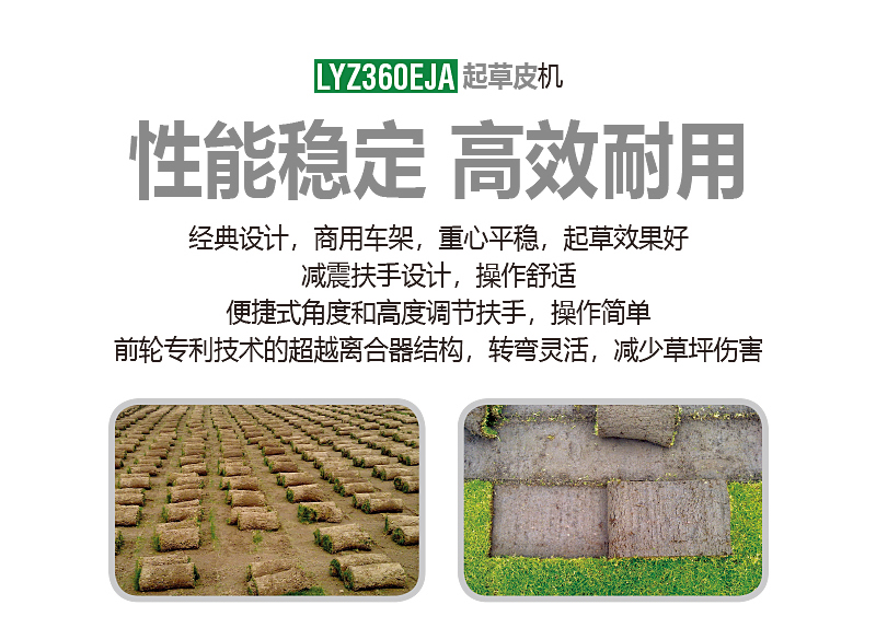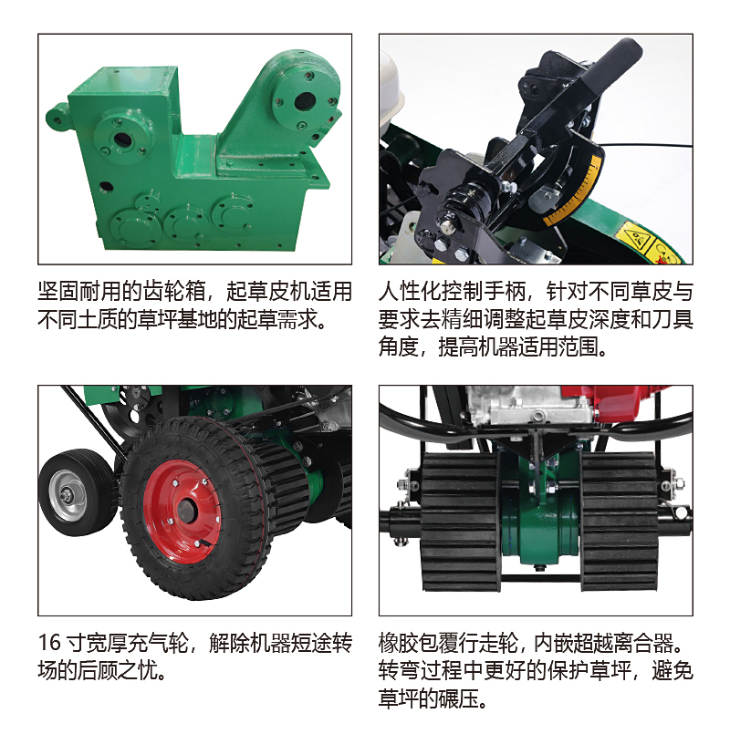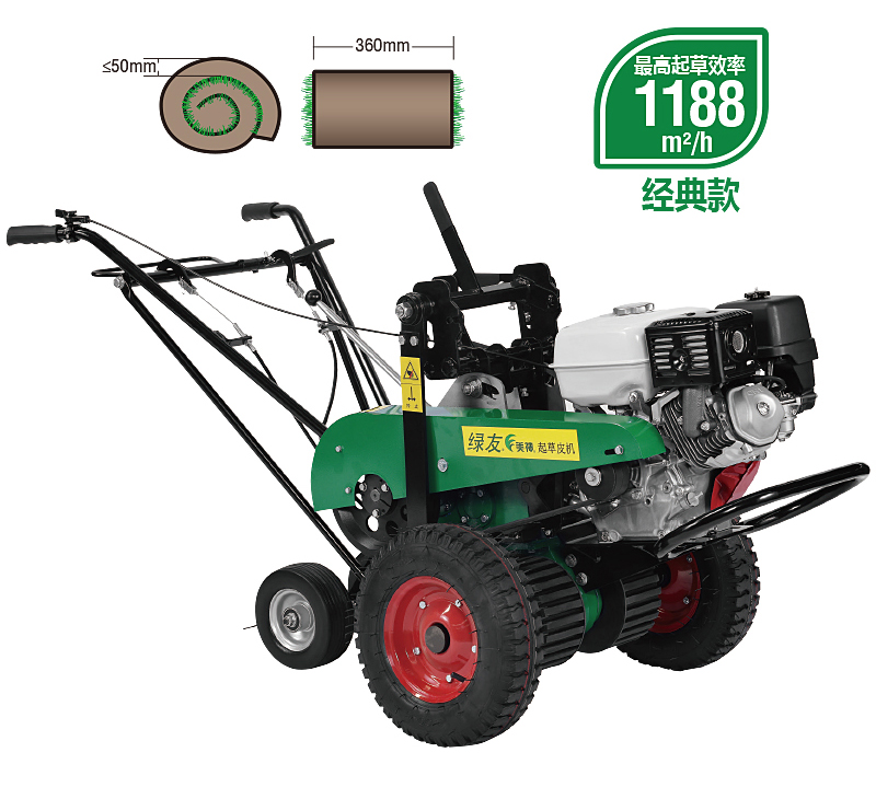 美神起草皮機(jī)根據(jù)人體工程學(xué)原理,改進(jìn)了操作方式,扶手增加減震,后輪為萬(wàn)向輪并配有超越離合器,轉(zhuǎn)彎方便且不損壞草坪,增加了操作者舒適度。本產(chǎn)品可根據(jù)不同草種和不同狀態(tài)草皮隨意調(diào)整起草的深度、角度,效率高。
