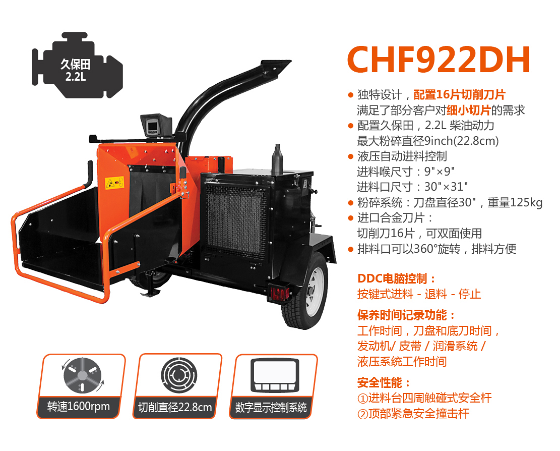 老熊(BEARCAT)品牌樹枝粉碎機,配置久保田2.2L柴油機,動力更強勁,最大可切削直徑23cm樹枝;智能液壓進料系統(tǒng)可自動監(jiān)控發(fā)動機轉(zhuǎn)速和進料狀態(tài),根據(jù)進料負荷的大小自動調(diào)整進退料;噴料口可360度旋轉(zhuǎn),隨意選擇噴料方向;切削刀片經(jīng)過特殊處理,堅固耐用并可多次修磨。