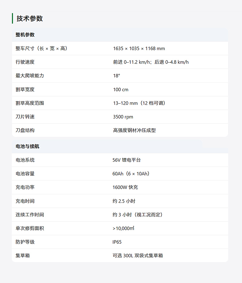 - ● 雙模式排草方案:側(cè)排草與 300L 集草箱任選,滿足不同場景需求。