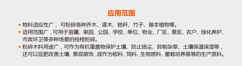 適用范圍廣,可用于苗圃、果園、公園、學校、單位、物業(yè)、廠區(qū)、景區(qū)、農戶、綠化養(yǎng)護、市政環(huán)衛(wèi)等多種場景枝椏粉碎,最大粉碎直徑10cm。